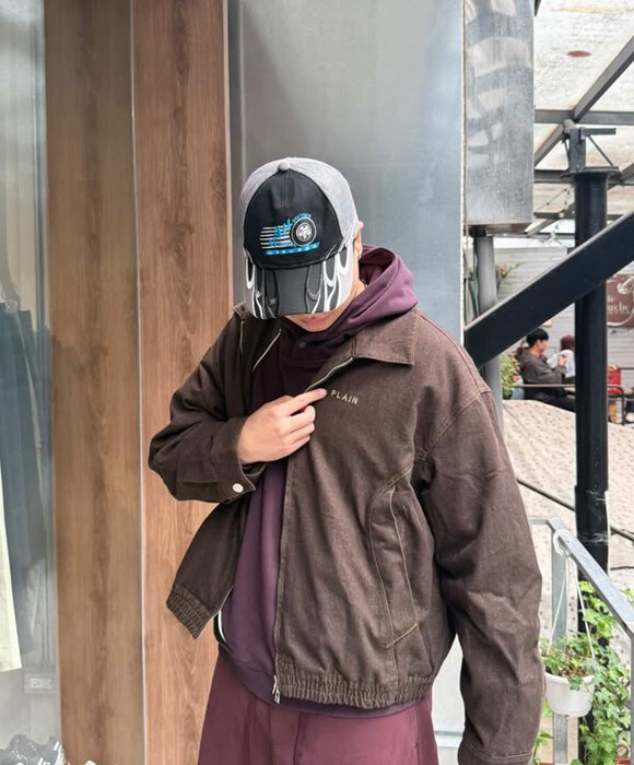 酒紅配色為基底,外搭深咖短版夾克,堆疊出沉穩的街頭層次。再運用網眼卡車帽與銀色運動鞋帶出亮點,手提帆布袋則平衡了整體的重量感,展現俐落風格!